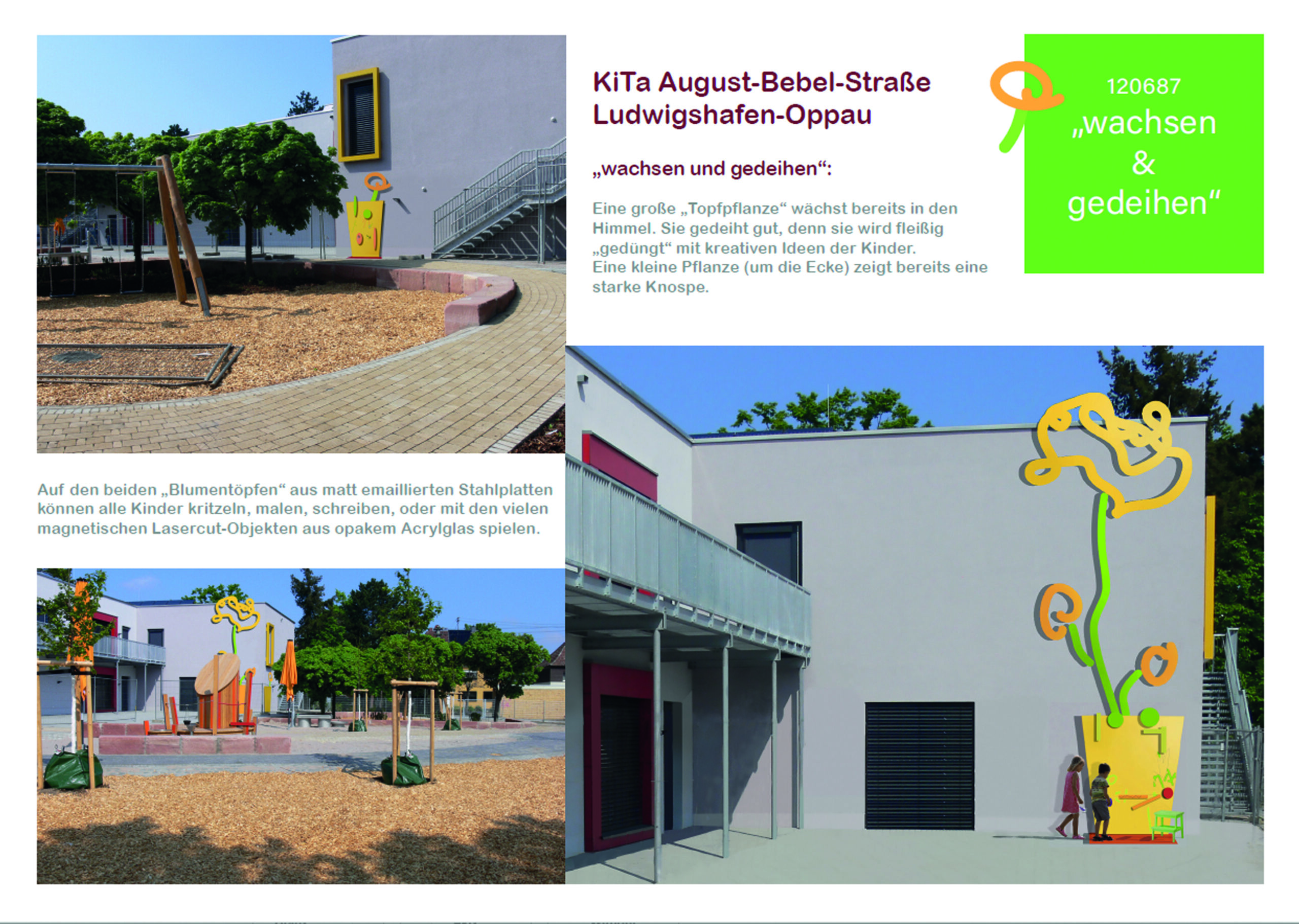 Eine große „Topfpflanze“ an der Wand wächst bereits über den Dachrand in den Himmel. Sie gedeiht gut, denn sie wird fleißig „gedüngt“ mit kreativen Ideen der Kinder. Eine kleinere Pflanze – bei der Treppe um die Ecke – zeigt bereits eine starke Knospe.